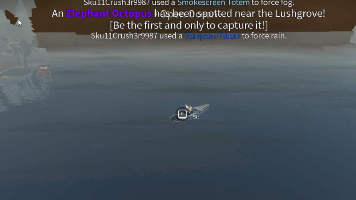 The Octophant Pool spawns only in the Second Sea near the Lushgrove POI. You can make it appear by repeatedly spamming both the Smokescreen and Tempest Totem, one after the other. If it spawns, you will receive a server-wide notification saying, "An Elephant Octopus has spawned near Lushgrove." Drive around the coast of the Island to find a bubble Octophant with a small fishing area.
